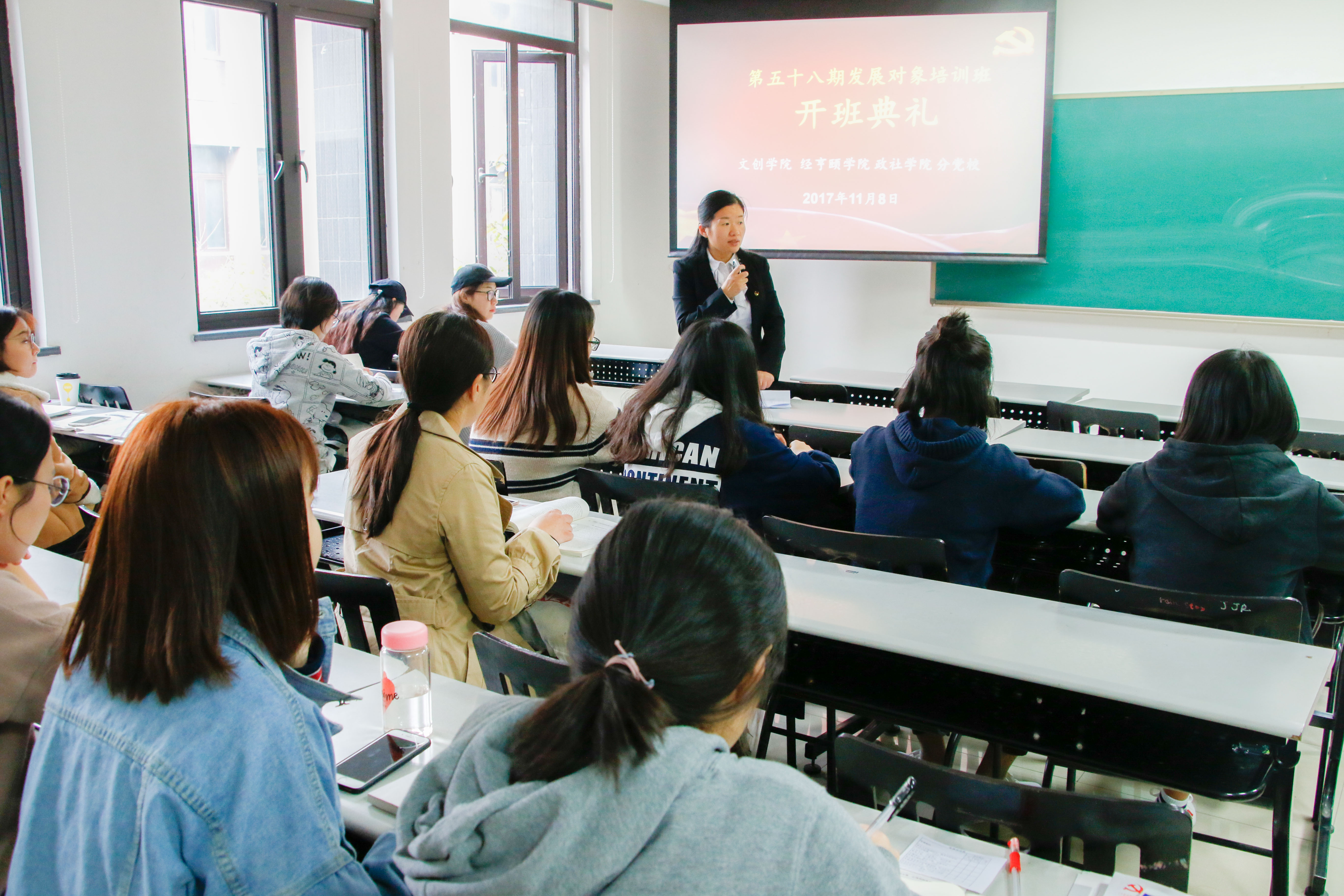 2017年11月8日14:50,我校文化创意学院、经亨颐学院、政治与社会学院分党校第58期发展对象培训班举行了开班典礼。文化创意学院学工办主任周凤琴老师首先介绍了近年来学院学生积极入党情况及学院学生发展学生党员规模概况,与同学们简要介绍了本次发展对象培训班的课程设置及课程开展形式;其次,向同学们介绍了本次发展对象培训班各学院学生负责人,以便更好交流开展培训工作。