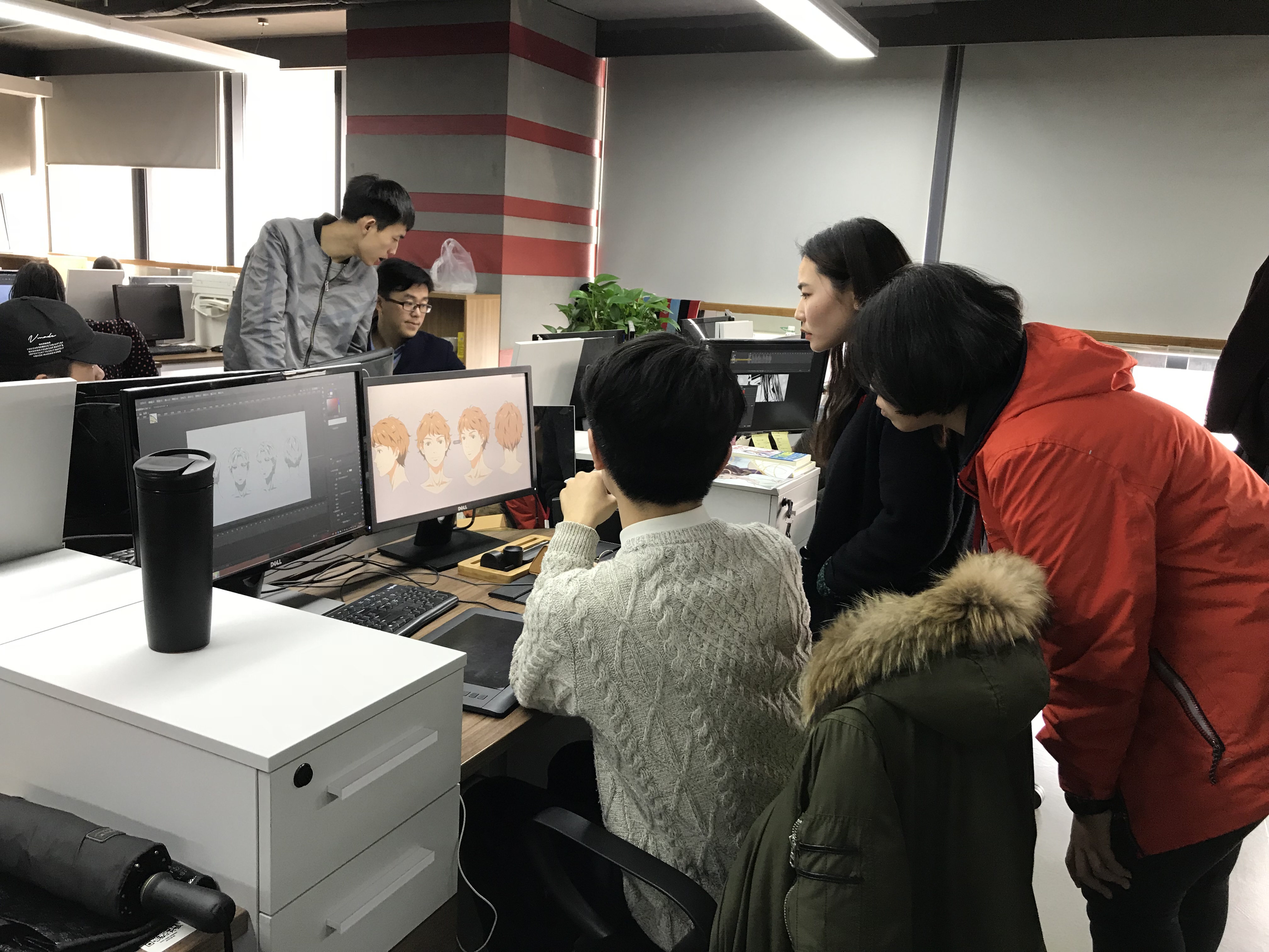 之后,在公司负责人的带领下,我们参观了娃娃鱼的办公区、多功能房等。徐鹏校友前期负责的是热播动画《国民老公带回家》的人物设计,他还特意为学妹们演示了设计的过程。