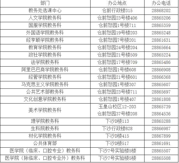 11.因各种特殊情况没选上课的同学,可联系开课学院给予解决,下表是选课相关部门的办公地点和电话。
