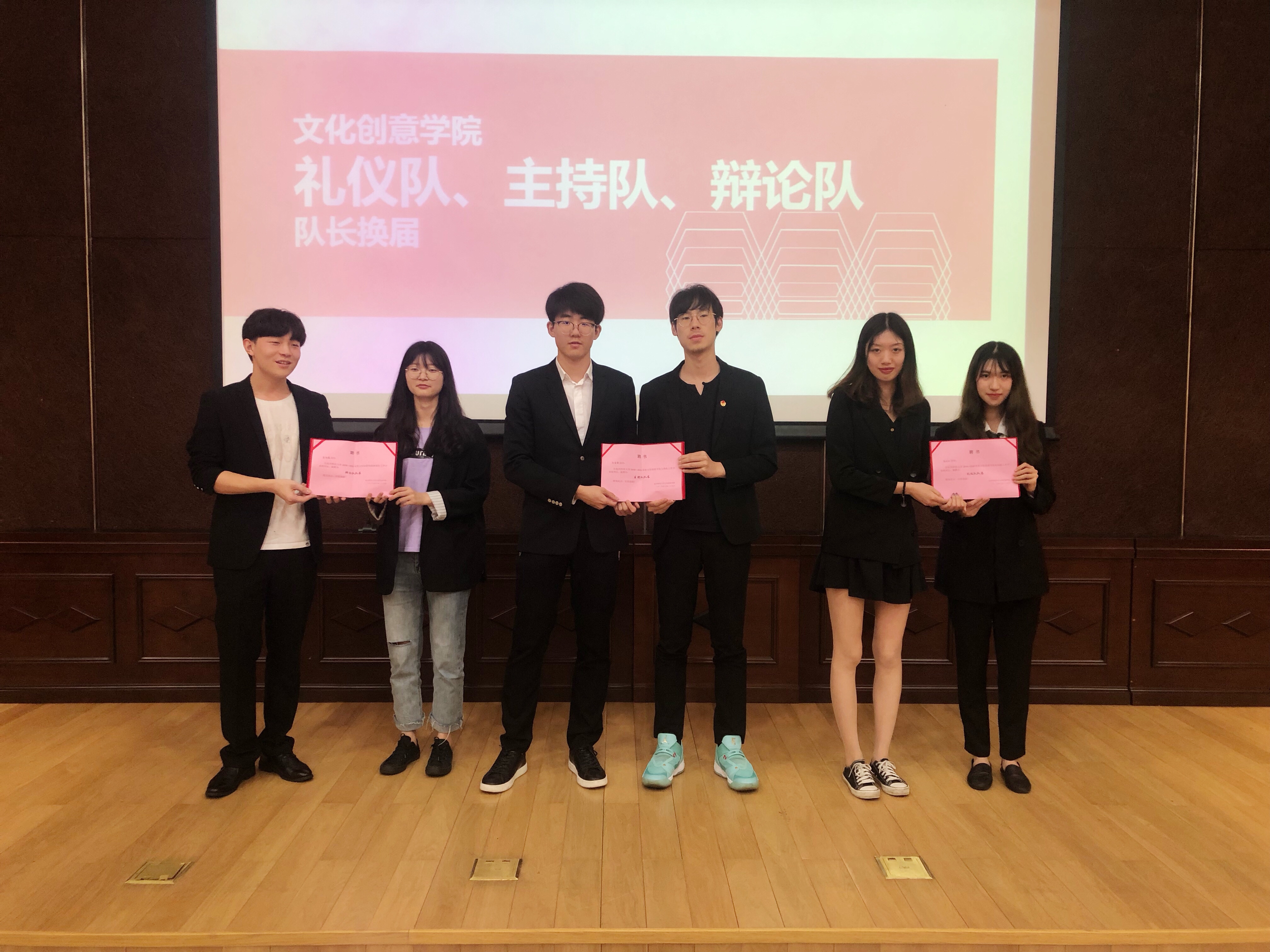 大会的第三阶段,由吴小燕宣读博彩平台 第四届优秀干部名单以及优秀干事名单,耿明峰老师和陈晓璐老师依次对获奖者颁发了证书并给予鼓励。除此之外,博彩平台 对学术与文体活动方面也有了下阶段的工作安排,主持人宣读了新一任礼仪队、主持队、辩论队的队长名单,并由前任队长向当选者颁发了证书。
