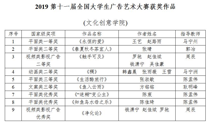 近日,第十一届全国大学生广告艺术大赛圆满落幕,博彩平台 师生载誉而归,共获国家级奖9项,含国家级一等奖1项、二等奖3项,三等奖2项,优秀奖3项,获奖成绩在浙江省同类高校中名列前茅。