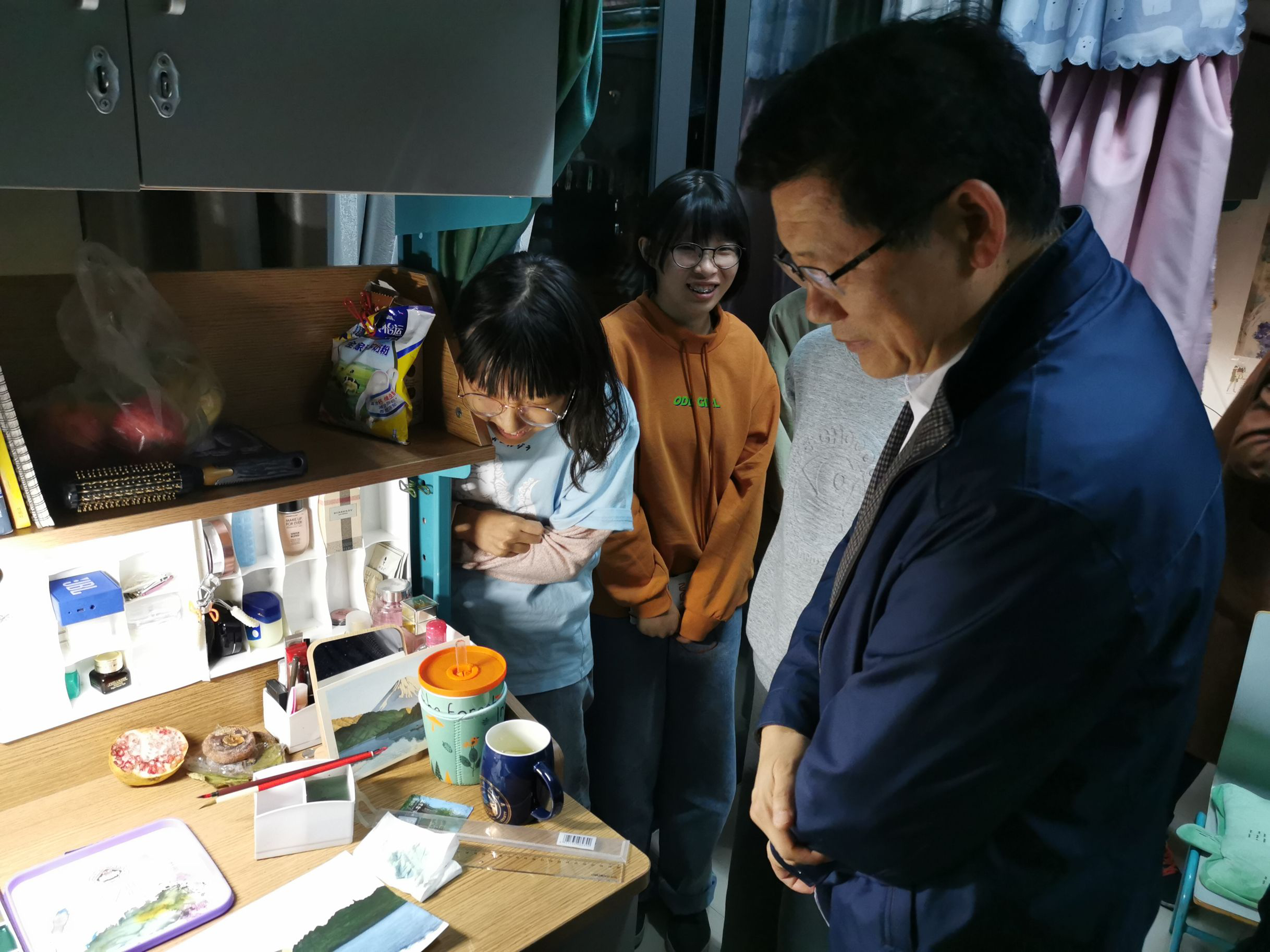 10月16日,副校长杨磊带领教务处处长夏卫东、后勤部门负责人在文化创意学院党总支副书记周微微、辅导员王斐敏等的陪同下走进学生寝室进行深入调研。