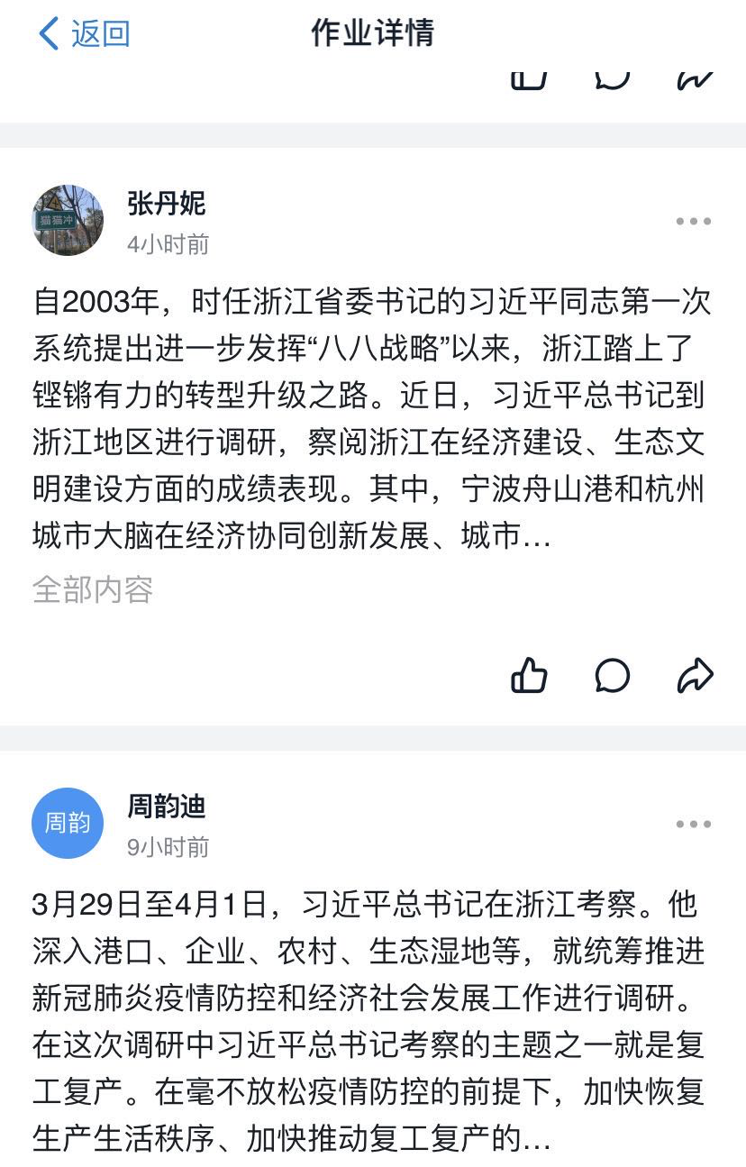 洪梓琳同学表示:今年是全面建成小康社会的实现之年、也是“十三五”规划的收官之年、脱贫攻坚的决胜之年,习近平总书记在浙江考察时的重要讲话,不仅给浙江和全国带来了打赢疫情防控阻击战必胜的信心,也鼓舞了全世界战胜疫情的斗志,更进一步表明了要夺取疫情防控和生产经营双胜利的决心!所以作为当代新时期学生党员的我们,更要努力提升自我素质,坚定理想信念,扎扎实实学原文、悟原理,牢牢把握精髓要义,主动担当、勇于创新,为建设新时代中国特色社会主义贡献自己的青春智慧和力量!