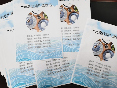 全体同学签订承诺书庄严承诺:“光盘行动,从我做起;珍惜粮食,不倒不弃;按需点餐,不够再添;拒绝铺张,理性消费;敬畏粮食,尊重劳动。”