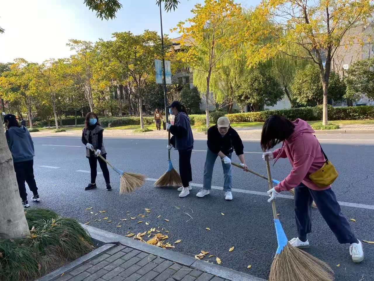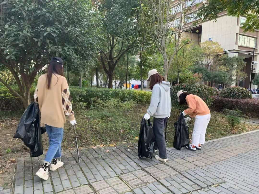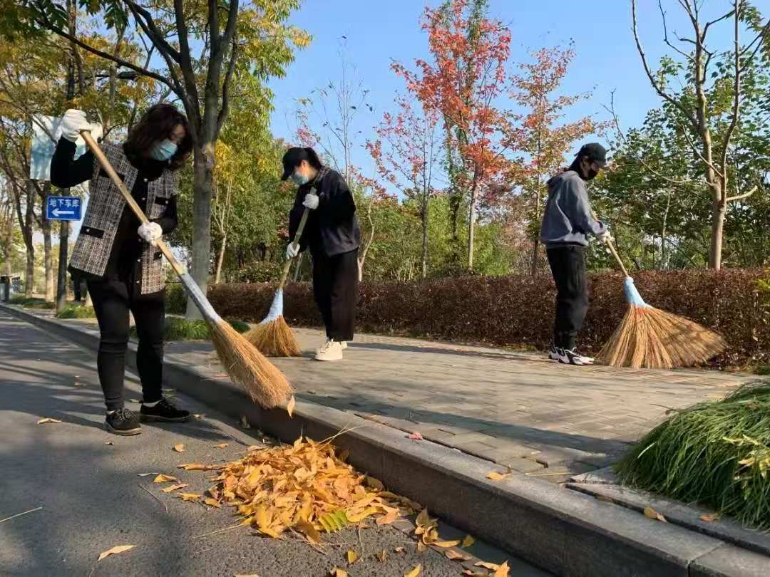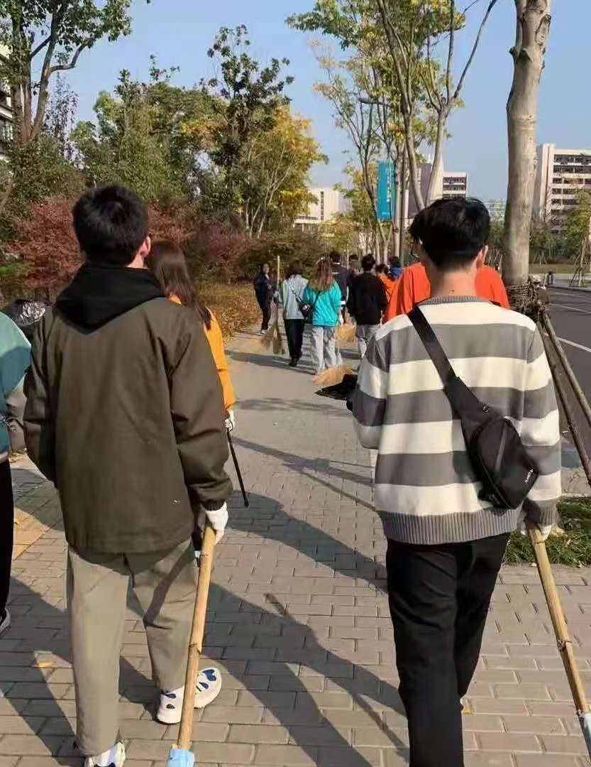 活动中,A区和B区协同作战,学生们不仅用扫帚清扫和堆放落叶,还用铁钳在草丛中捡取各种垃圾,并将其放入垃圾袋中。在参与劳动的过程中,每位文创学子严格遵守规定和安排,积极参与劳动。