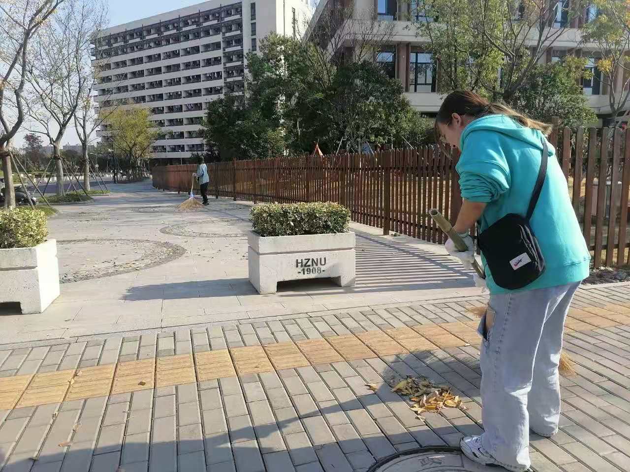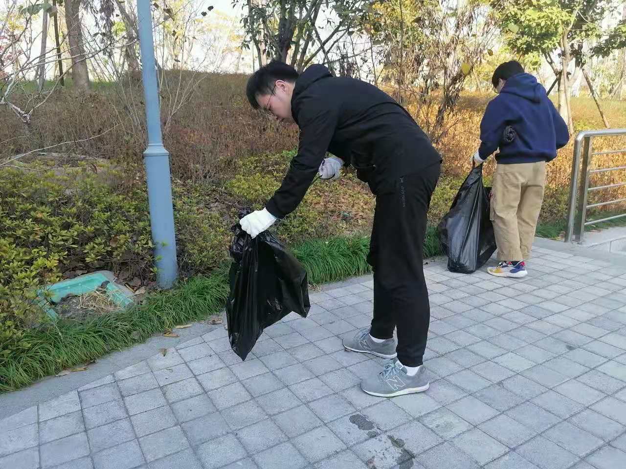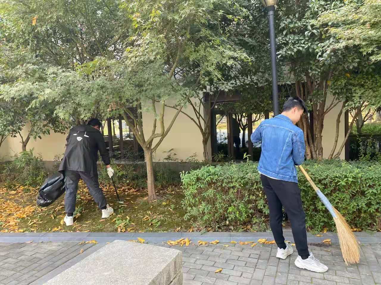 活动中,A区和B区协同作战,学生们不仅用扫帚清扫和堆放落叶,还用铁钳在草丛中捡取各种垃圾,并将其放入垃圾袋中。在参与劳动的过程中,每位文创学子严格遵守规定和安排,积极参与劳动。