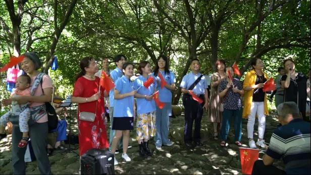 图为小分队赶赴井冈山和当地群众同唱红歌