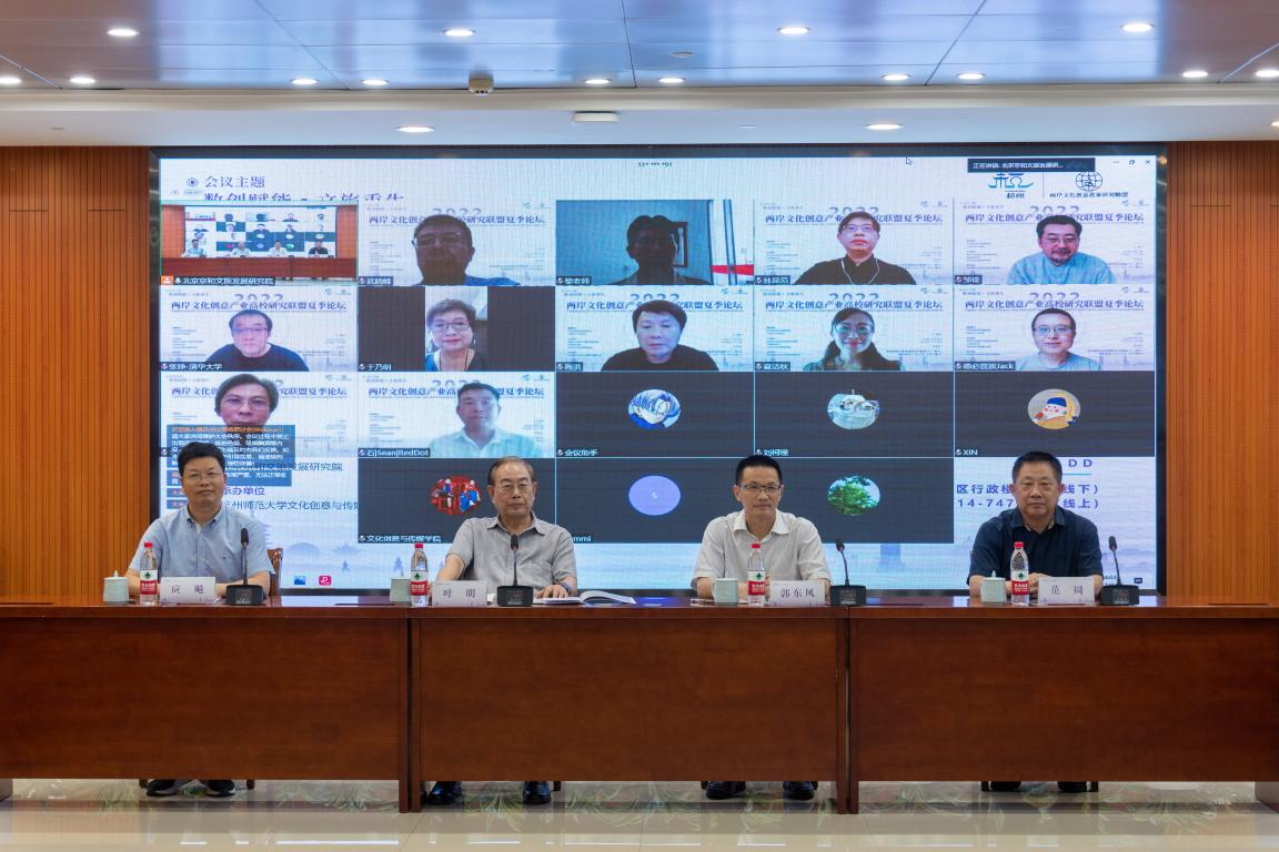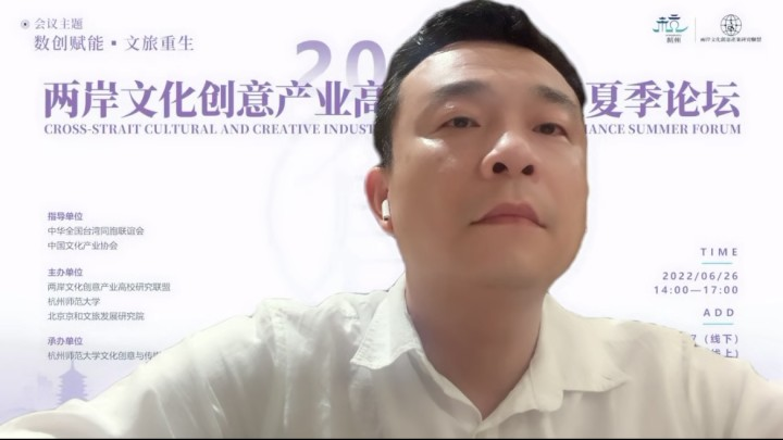 全国台联文化宣传部部长武晓峰先生通过云端为论坛致辞,他代表中华全国台湾同胞联谊会,对2022两岸文化创意产业高校研究联盟夏季论坛的顺利召开表示热烈的祝贺!他指出在总书记“深化两岸融合发展,夯实和平统一基础”的引领下,如今海峡两岸文化交流越来越多。中华文化是两岸同胞心灵的根脉和归属,也是两岸同胞共同推动两岸关系和平发展的精神源泉。两岸文化创意产业的蓬勃发展为文化沟通搭建了良好的平台,以创新创意赋能两岸文化产业发展,以数字经济助推两岸旅游产业重生,实现互利双赢、互补共进,共同推动我国文化产业和旅游业高质量发展。