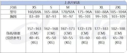 (五)跑步需着主办方统一发放的上衣(上衣尺码表参考下图),搭配个人深色运动裤(服装发放另行通知)。