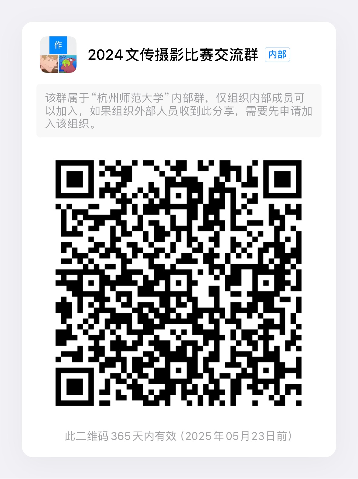 竞赛通知及后续信息核对会通过钉钉群,请在报名后务必钉钉扫码加入群组“2024文传摄影比赛交流群”
